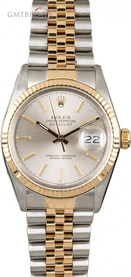 Manufacturer: Rolex Model Name/Number: Datejust 16013 Serial/Year 9,6XX,XXX - 1987 - 1988 Grade: (What's This?) II/III - slight bracelet stretch Gender: Men's Movement / Features: Automatic 3035 movement w/ date, acrylic crystal, waterproof screw-down crown Case: Stainless steel w/ yellow gold fluted bezel (36mm) Dial: Silver w/ yellow gold Index hour markers Bracelet: Stainless steel and 18k yellow gold Jubilee w/ Fliplock clasp Box & Papers Rolex box, booklet, and papers Comments: This pre-owned Rolex Datejust comes w/ Bob's 3-day satisfaction guarantee and one year warranty Rolex Datejust 16013 Print Page Certified Authentic ?Click To Enlarge Certified Authentic Report Learn More *CERTIFIED 100% AUTHENTIC - ALL WATCHES ARE GUARANTEED TO BE 100% AUTHENTIC FACTORY ROLEX. DISCLAIMER: All Sell prices are based on watches in good, salable condition in no need of any repair. This item is previously owned. All in-store sales are final and do NOT come with the 3 day return policy. The 3 day return policy is for online sales only. All prices are subject to change depending on market conditions. Advertising: All ads stating that prices are up to a certain percent off pertain to the full retail price of a new watch. For instance, if an ad says "Up To 15% off" this means that our price is up to 15% less than what the full retail price of a new watch would be. All watches are shipp